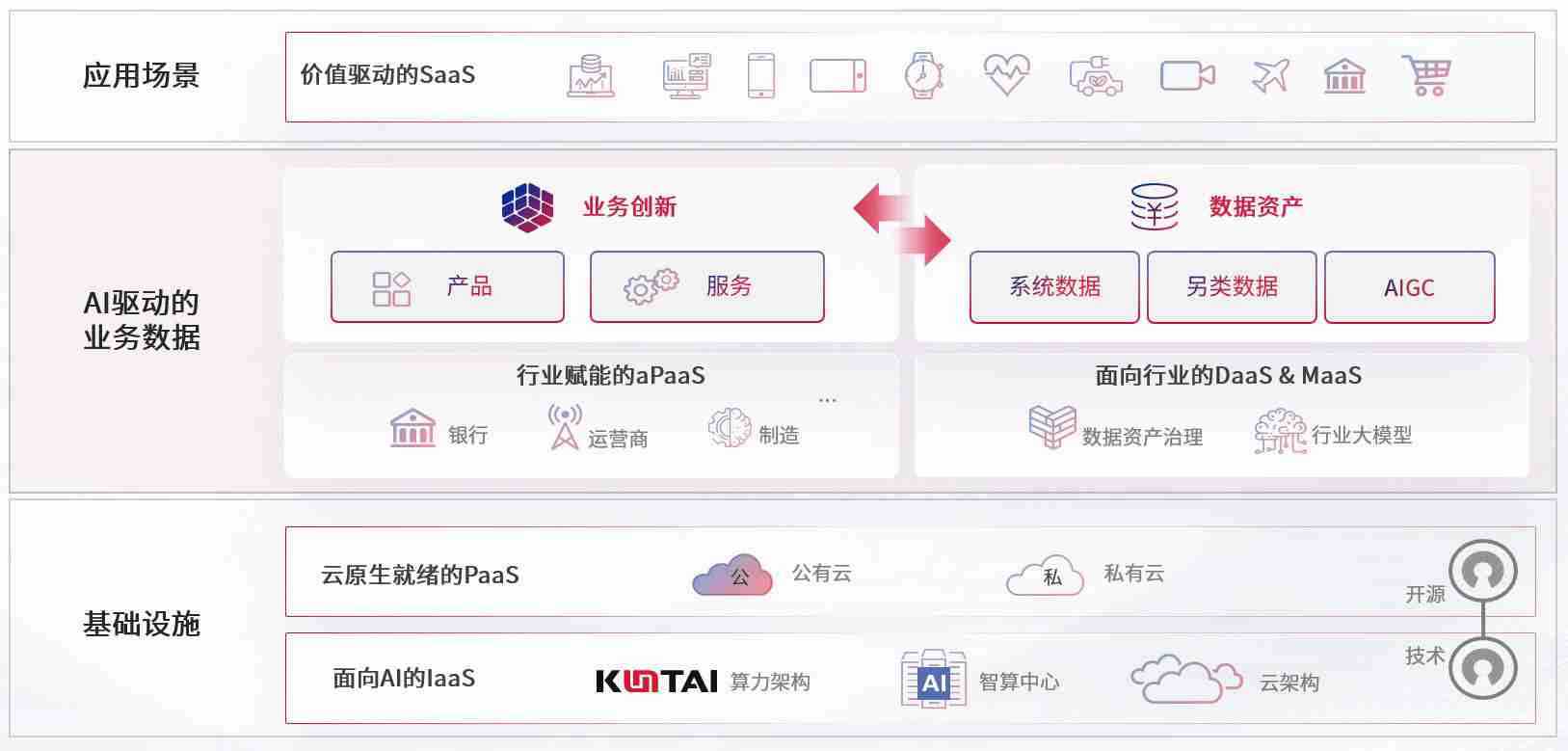 数字时代,,围绕企业数字化转型的关键要素,,NG集团数码开创性的提出数云融合战略和技术体系框架,,着力在云原生、、数字原生、、、AI原生和信创产业上架构产品和服务能力,,,为处在不同数字化转型阶段的快消零售、、汽车、、金融、、、医疗、、政企、、教育、、、运营商等行业客户提供泛在的敏捷IT能力和融合的数据驱动能力,,,,构建跨界融合创新的数字业务场景和新业务模式,,,助力企业级客户建立面向未来的核心能力和竞争优势,,,,全面推动社会的数字化、、、智能化转型升级。。。。